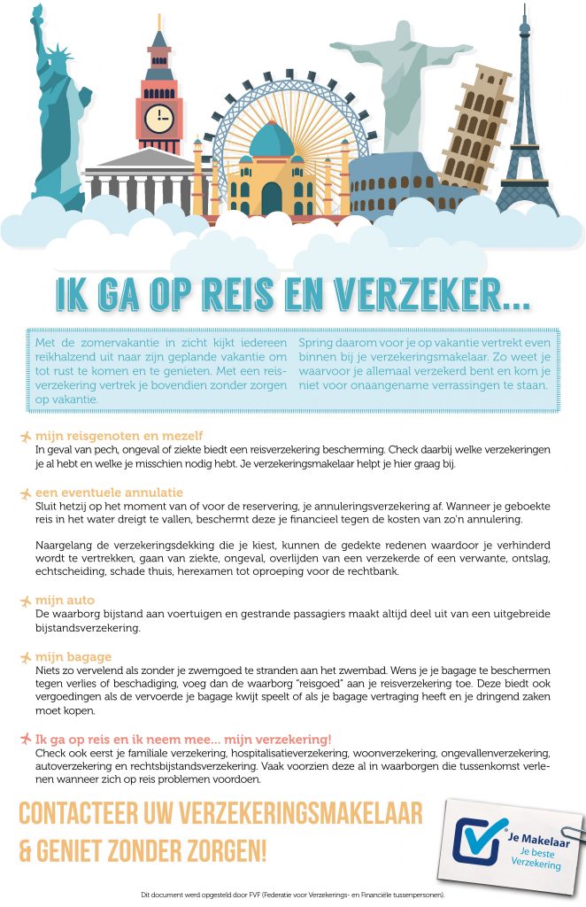 Bijstand Personen: In België kan uw reisverzekeraar u voor u op reis vertrekt doeltreffend helpen door u gezondheids- of welzijnsinformatie te verstrekken. Wanneer zich tijdens een reis een geval van ziekte of een ongeval voordoet kan hij eveneens thuis bijstand verlenen tijdens en na een hospitalisatieperiode (hulp bij huishoudelijke taken, kinderopvang voor kinderen onder de zestien jaar, …).